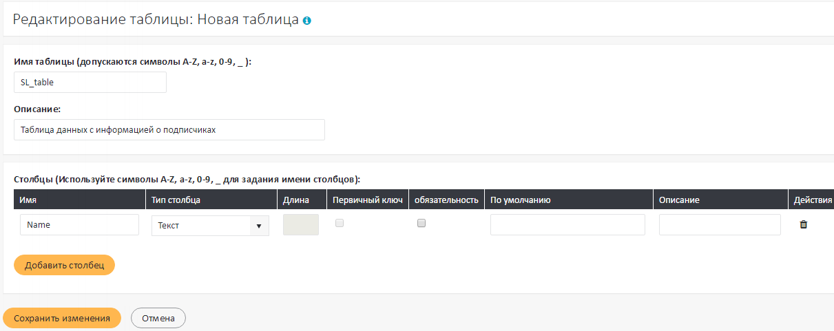 С помощью кнопки «Добавить столбец» можно создать дополнительно необходимое число столбцов таблицы и задать их характеристики.