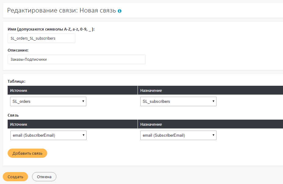 Таблицы могут быть связаны друг с другом по определенному полю или полям. Если таблицы не связать, данные из них можно использовать только в письмах, но не в сегментации. Если связать таблицы, информацию из них можно использовать не только в письмах, но и в сегментации.