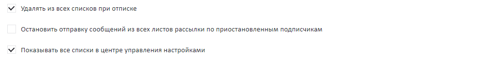 Также на этой вкладке можно настроить удаление подписчика из всех листов при отписке, останавливать все рассылки по приостановленным подписчикам и показывать все списки в менеджере предпочтений.