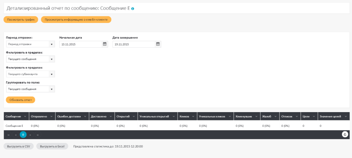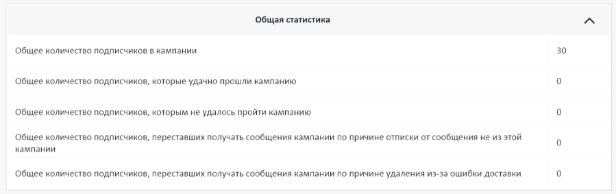 - показывает информацию о количестве кликов, открытий и конверсий для конкретного сообщения кампании.
