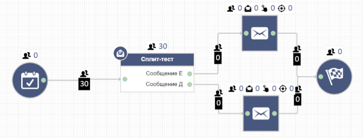 Далее вы попадаете на визуальное отображение данных о кампании, где можете посмотреть, сколько подписчиков в данный момент находится на каждом шаге кампании, а также получить информацию о количестве кликов и открытий по каждому из сообщений кампании.