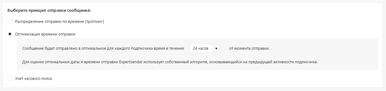 Для оценки оптимальных даты и времени отправки ExpertSender использует собственный алгоритм, основывающийся на предыдущей активности подписчика.